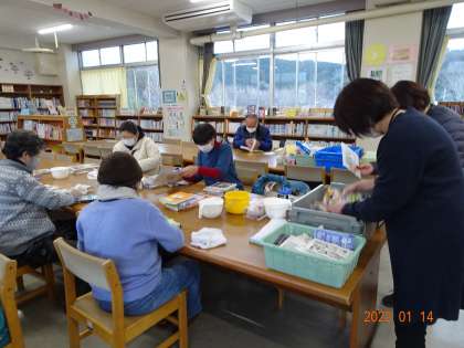 新年最初の図書館整備、寒い中にもかかわらず多くのボランティアの皆さんにお越しいただきました。子どもたちに人気の「サバイバルシリーズ」などは傷みが早くなりがちですが、ボランティアさんが慣れた手つきで手際よく修理し、表紙をきれいに磨いてくださっています。ボランティアさんのお陰で、大好きな本がいっぱいの古瀬間小図書館になっています。