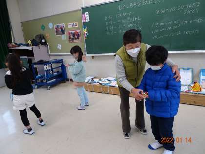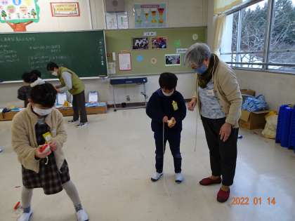 【昔遊び 1年2組】1/14 公開日 2022/01/17 更新日 2022/01/17 各学年から 子どもたちが楽しみにしている「昔遊びの会」。今回も地域講師の方々にお越しいただき、コマやけん玉、お手玉、あやとりなどを教えていただきました。コマでは、紐の巻き方や回すときのコツを丁寧に教えていただき、「やった、回った」と嬉しそうな声が響いていました。