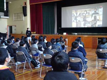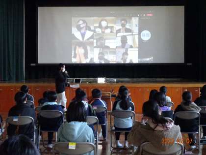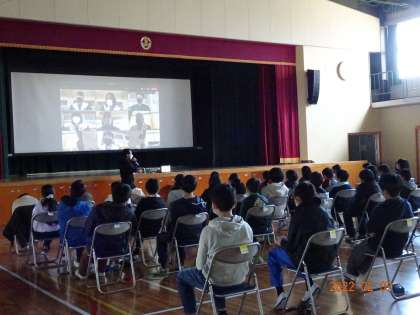 4月から中学生になる子どもたちに、益富地区とは異なる地区に関心をもつとともに、同じ豊田市内で学ぶ仲間と感じてほしいと願い、実現しました。交流では、学年全員が体育館のスクリーンに映された画面を見ながら、リアルタイムに自己紹介をしたり、質問をしたりして、和やかな雰囲気になりました。