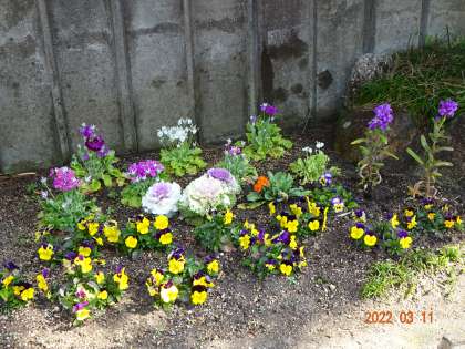 正門、玄関前、職員室前の花壇に色とりどりの花が咲きました。暖かな日差しに春の訪れを感じます。正門前の花は、地域のボランティアの方がずっとお世話をしてくださっていました。心から感謝しています。