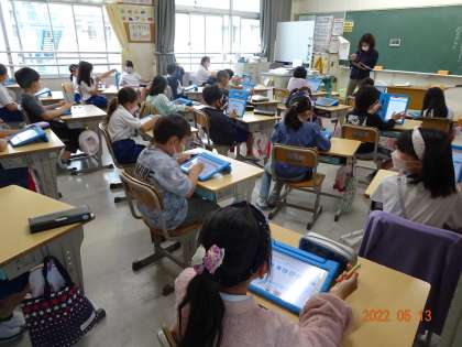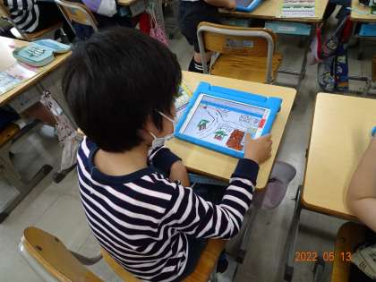 3年生がタブレットの持ち帰りに向けて、スカイメニュークラウドの使い方を練習しました。出欠ノートや発表ノートの入力や提出の仕方を先生に教えてもらうと、すぐに自分でもやってみる子どもたち。自分の知っている地図記号や家の周りの様子を描き、発表ノートに送ってみんなで共有してみました。タブレットの使い方を覚え、より楽しく学習を進められるように先生たちも工夫していきます。