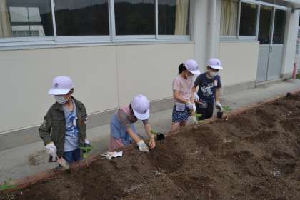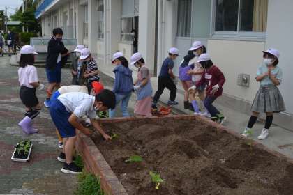 ひまわりボランティアの子どもたちが、ポットに植えた種。15cmくらいに生長し、みんなで花壇に植え替えをしました。大事そうに両手で持ち、穴に入れてそっと土をかぶせます。「ぐんぐん大きく育ってね。」「きれいな花を咲かせてね。」と願いを込めて水をやりました。