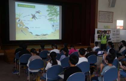 6年生が、益富交流館で、「ホタル学習会」を行いました。蛍友会の皆さんから益富地区に生息するゲンジボタルの生態や一生について説明をしていただき、「ゲンジボタルが古瀬間地区で見られるのは、35年前の地域の方々が環境保全やゲンジボタルの保護や育成をしてくれてそれを今までつないでくれたおかげです。」とのお話を聞き、子どもたちは興味津々の表情で聞いていました。ゲンジボタルの幼虫や幼虫の餌のカワニナを間近で観察し、小さな生命が一生懸命生き、美しい輝きを見せてくれることに感銘を受けていました。