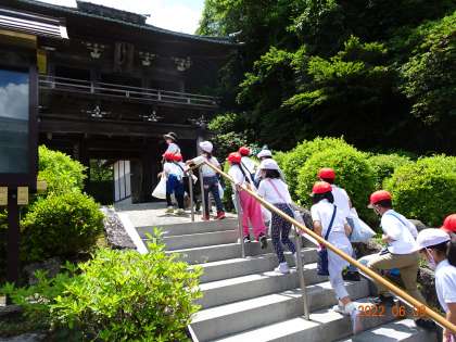 6月9日(木)2年生は古瀬間城址で梅取り体験を行いました。15分ほど歩くと浄願寺のあじさいの花に出迎えられ、階段を上がっていくと20数本の梅林に到着。