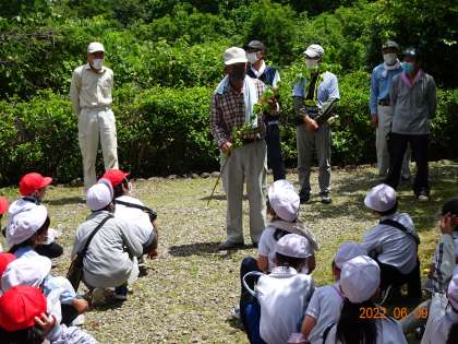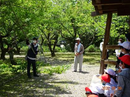 保存会の皆様が出迎えてくださり、子どもたちが取りやすいように、竹で梅を落としてくださいました。