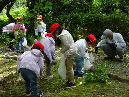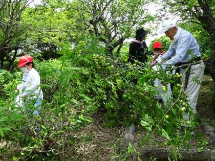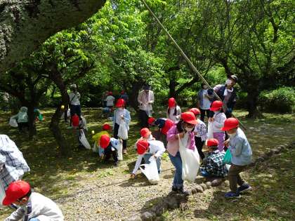 【1年梅取り】6/13 公開日 2022/06/14 更新日 2022/06/14 特色ある学校づくり推進事業 1年生が浄願寺の梅林で梅取りをしました。地域の保存会の皆さんが木にたわわに実った梅を落としてくださったり、実がたくさん付いている枝を切ってくださったりして、子どもたちは大喜びで袋いっぱいに梅の実を集めました。集めた梅は、梅ジュースにする予定です。保存会の皆さんの温かいご協力で、地域の良さを体験でき、みんな笑顔いっぱいになりました。