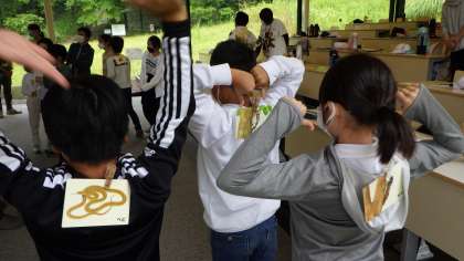 4年2組が自然観察の森に行きました。「私はだれでしょう」ゲームでは、生き物の足の数や食べ物、鳴き声、しっぽの有無などについて、質問をし合い、自分の背中にクリップで止められた動物が何なのかを一生懸命考えていました。