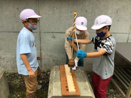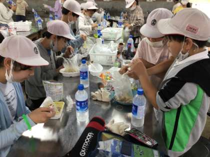 キャンプは予定より若干遅れ気味ですが、上手に野外炊事を終えることができました。最初に防災カレーの食材をセットした後、かまどの準備をして火起こし体験をしました。所員の方が最初にお手本を示してくださったのですが、いざみんながやってみると、なかなか火が起きません。何度も挑戦してようやく全ての班が火を起こすことができました。その火をかまどに移して湯を沸かしカレーを作りました。水を入れただけの御飯はやや固めでしたが、おいしくカレーライスをいただきました。やけどなどの怪我もなく元気に夕食を終えました。