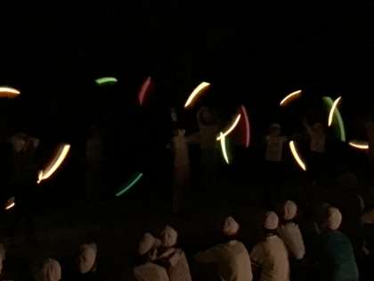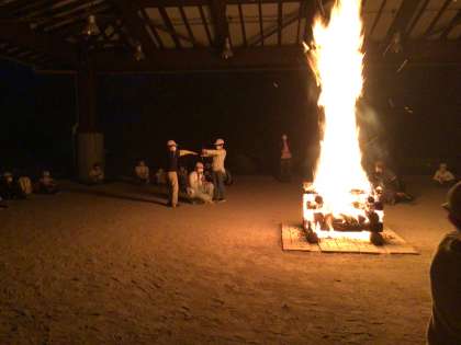 夕食後に待ちに待ったキャンプファイヤーを行いました。学校から教頭先生や昨年度の担任の先生たちが応援に来てくださりました。実行委員が楽しいゲームを進めたり、素晴らしいトーチワークを披露したり思い出に残る行事となりました。ファイヤーの後は、1日の振り返りを行い夜食を食べ9時半に就寝となりました。
