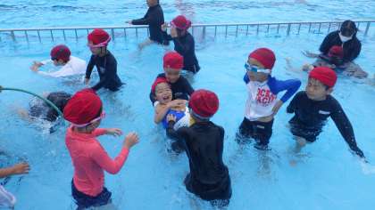1年生のプール納め。子どもたちがわくわくしながら取り組んだプールの学習も今日で終わりです。水の中で目を開けることができるようになった子、鼻から息を出すことができるようになった子、輪やバーをくぐることができるようになった子、みんな楽しみながら成長を感じることができました。