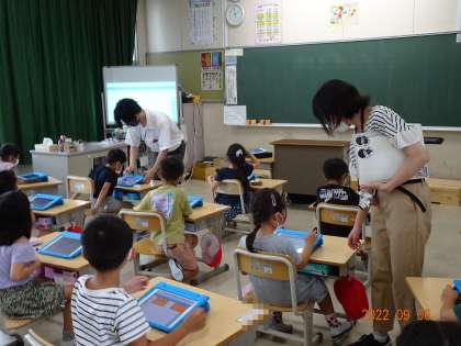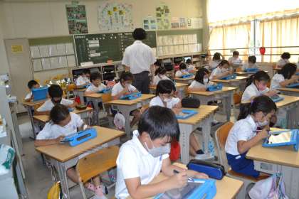 ICT支援員の先生に来ていただき、1〜3年生の子どもたちが授業での効果的な活用について教えていただきました。「スタディノート」を使い、基本的な入力方法や、互いの作品を見合ったりする方法を教えていただきましたので、今後、授業でもいろいろな場面で使っていきたいです。
