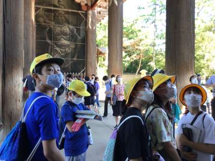 修学旅行1日目午後、法隆寺の見学後、本日最後の見学地、東大寺を訪れました。世界最古の木造建築や大仏の迫力に驚くとともに間近で見ることができて感動した様子でした。この後、宿泊する「よしだや」へ向かいます。