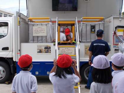 【防災体験】9/21 公開日 2022/09/22 更新日 2022/09/22 学校行事 午前の避難訓練に続き、午後は2〜6年生が防災体験に取り組みました。 2・6年生は地震体験車、3・4年生は煙道体験、5年生は救助袋体験です。 消防署職員の皆様の協力により、子どもたちは災害の怖さや避難方法を真剣に学ぶことができました。