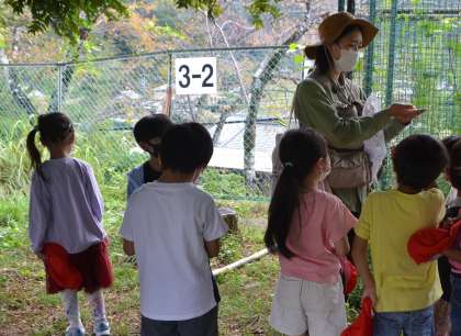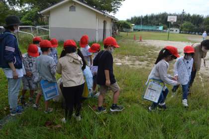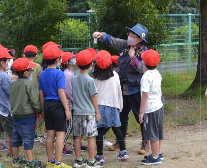 【1年 生き物調査】9/29 公開日 2022/09/29 更新日 2022/09/29 各学年から トヨタの森と自然観察の森から3名の隊長さんに来ていただき、1年生が学校の運動場の生き物調査をしました。日ごろから見慣れている運動場も草の茂みや木陰に思いのほかバッタやコオロギなどの昆虫やトカゲやカナヘビなどの生き物がいます。隊長さんに教えていただき、生き物への関心がふくらみました。「今日はどんな生き物を見つけられるかな」、これから運動場に行くのが楽しみになりそうです。