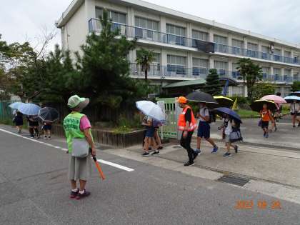子どもたちの安全な登下校のために、毎月グリーンレンジャー定例会を行っています。今日は、定例会の後の一斉下校で、先生たちが通学班に付き添い、子どもたちの様子を見守りました。