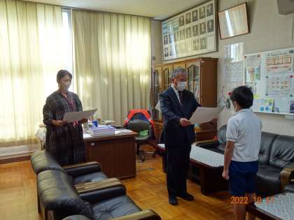 今日から後期がスタート。朝のモジュールの時間にオンラインで前期・後期切替式を行いました。2・4・6年の代表児童が、前期に頑張ったことや後期の目標を思い思いに発表しました。校長先生のお話では、人によって時間の速さの感じ方は違うけれども、時間を大切にして後期を有意義に生活してほしいと話されました。切替式の後、夏休みの作文や詩、感想文などの表彰をしていただきました。