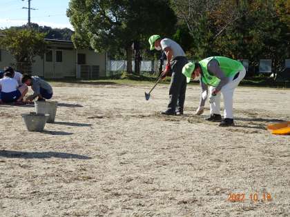 地域学校共働本部からの呼びかけで、学校整備ボランティアによる草取りボランティアを実施していただきました。毎朝子どもたちの登下校時の見守りをしてくださっているグリーンレンジャーの方々や児童の保護者やお家の方が、朝早い時間にもかかわらず熱心に運動場の草取りをしてくださいました。6年生の有志児童も加わり、グランドの西側がかなりきれいになりました。次回は、10月21日(金)に予定しています。運動会当日、子どもたちの一生懸命な演技がきれいな運動場で輝くよう、草取りを進めていただいていることに感謝しています。