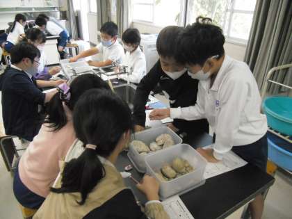 子どもたちからは「石は山から運ばれると思っていたけど、流れによって形を変えたり土を削ったりしてやがて海にたどり着き、砂に変わって魚のすみかになると知り、びっくりしました。」などの感想が出されました。石を学ぶことで森林の学習と結び付き、環境にも密接に関連していることをしっかりと学ぶことができました。