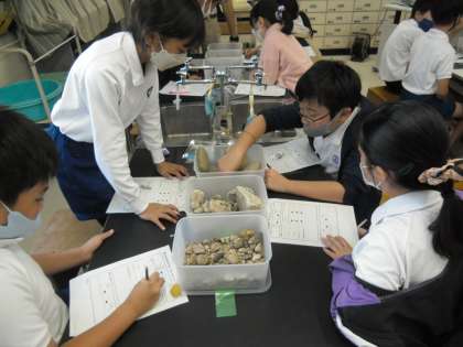 川の流れによる石の形の変化を観察したり、その理由を予想したりして実物に触りながら違いを見付けて学びました。
