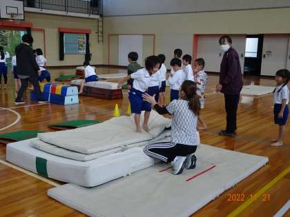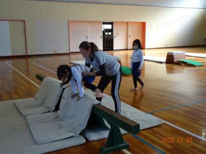 1年2組の授業参観の時間に体力向上補助指導員の先生がサポートしてくださいました。跳び箱運動を楽しんで行うことができるように、コースを工夫したり、丁寧に補助をしてくださったりしました。体力向上補助指導員の先生は、低学年の体育の授業の支援をしてくださっています。先生のおかげで子どもたちは安心して楽しく体育の授業に取り組んでいます。