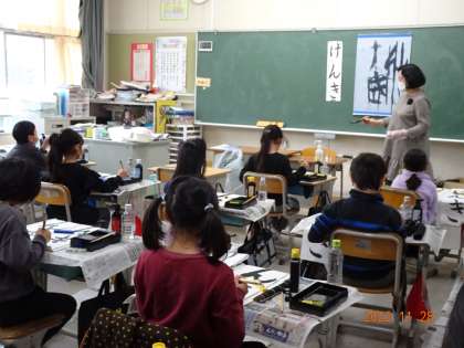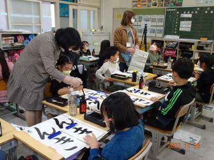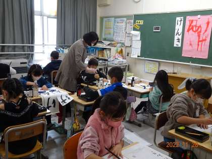 【書写指導 3年】11/28 公開日 2022/11/29 更新日 2022/11/29 各学年から 3年生にとって初めての毛筆での書き初め。初日は、書写ボランティアの講師の先生に来ていただき、基本的な筆運びのこつを教えていただきました。緊張しながら筆を進ませる子もいましたが、講師の先生に丁寧に声をかけていただき、楽しく練習に取り組むことができました。