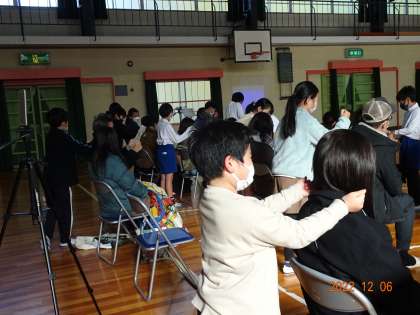 【学習発表会 4年1組 その2】12/6 公開日 2022/12/07 更新日 2022/12/07 各学年から 発表の後は、保護者の方へ感謝の気持ちを込めてマッサージタイム。親子で笑顔いっぱいの時間になりました。