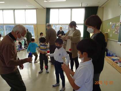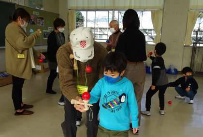 【むかし遊びの会 1の1】12/7 公開日 2022/12/07 更新日 2022/12/07 特色ある学校づくり推進事業 1年生の「むかし遊びを教えていただく会」。初日は1年1組。地域講師や保護者によるボランティアの皆さんにコマやけん玉、あやとりやお手玉、ブンブンゴマを教えていただきました。「初めてコマが回ったよ」「見て見て!けん玉が決まったよ。」ボランティアさんに丁寧に教えていただき、嬉しそうな声が響いていました。 【「むかし遊びの会」は「特色ある学校づくり推進事業の一環です。】