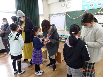 2年2組の学習発表会。子どもたちは、小さかった頃の様子やできるようになったことについて、見ていただく方に伝わるように工夫してまとめ、発表しました。「タブレットを使って頑張って発表していて、2年生になってすごく成長したなと思いました。」と温かい言葉をいただき、子どもたちは、嬉しそうな笑顔になっていました。最後に感謝の気持ちをこめて、手作りのプレゼントをお家の方に渡しました。