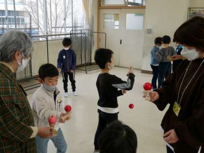 2回目の1年1組むかし遊びの会。冬休みに家族とやってみたり、練習したりした子もいて、前回よりも子どもたちは意気込んで取り組みました。「けん玉ができるようになったよ」「ブンブンごまが伸びたり縮んだりするのが楽しいね」と楽しそうな声があちこちから聞こえてきました。地域講師の方や保護者ボランティアの方に優しく教えていただき、昔の遊びを通して、温かいふれあいの時間にもなっていました。