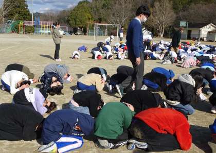 校長先生のお話の中で、首や頭を守るための「ダンゴムシのポーズ」を全員で確認しました。もし、大きな地震が起きても、大切な命を守れるようにご家庭でも話し合っていただけたらと思います。