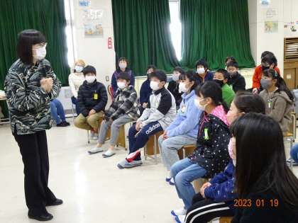 紙芝居作家松井エイコさんに来ていただき、6年生が平和学習のお話を聞きました。はじめに「戦争」「平和」について松井さんから聞かれると、戦争のニュースに関心をもっている子も多く、多くの子がそれぞれの思いを発表しました。戦時中、松井さんのお母さんが体験を綴った手記や、紙芝居「二度と」の「NO MORE 広島、NO MORE 長崎」という語りから、戦争の悲惨さや平和の大切さが子どもたちの心に強く残ったことでしょう。