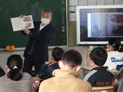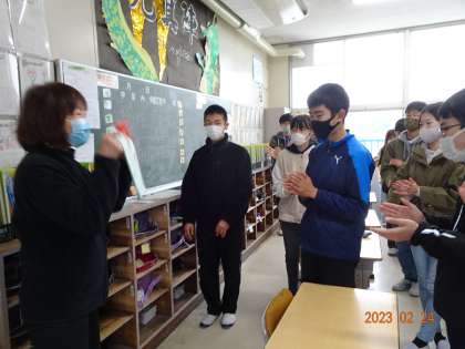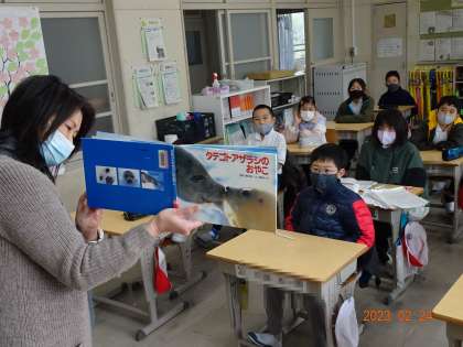 【おはなしの森 高学年最終】2/24 公開日 2023/02/24 更新日 2023/02/24 地域学校共働本部 高学年のおはなしの森。6年生にとっては、小学校生活最後の読み聞かせです。6年2組では、校長先生が英語の絵本の読み聞かせをしてくださいました。 各クラスで感謝の気持ちを込めてお礼の手紙を渡しました。