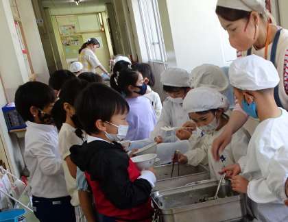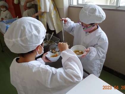 【1年 給食当番】4/28 公開日 2023/04/28 更新日 2023/04/28 各学年から 1年生の給食。入学して1か月たち、給食当番の仕事も進んでできるようになりました。今日の献立のかしわ汁もこぼさないように気を付けて、上手によそいました。自分たちでできることが一つ増えるごとに、小学生として確実に成長していることを感じます。おいしい給食をぱくぱく食べてすくすく育ってほしいと願っています。
