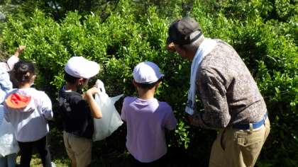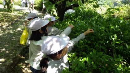 【2年生 お茶摘み体験】5/10 公開日 2023/05/11 更新日 2023/05/11 各学年から 2年生が学校から歩いて浄願寺に出かけ、お茶摘み体験をしました。ボランティアの方に付き添ってもらいました。地域の方からどの葉を採るのか教えてもらいました。