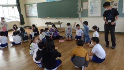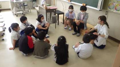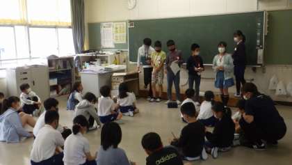 1年生を迎える会を行いました。レッツ班(縦割り活動)で集まってまずは自己紹介。1年生はお兄さん、お姉さんの名前を一生懸命覚えていました。これからこの班で一年間交流していきます。