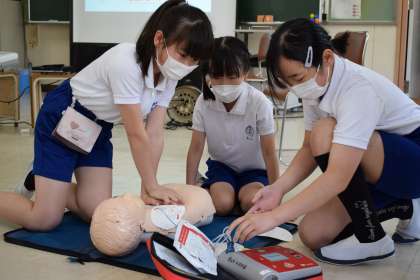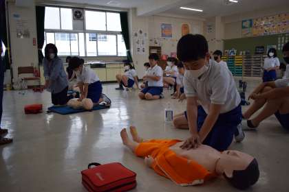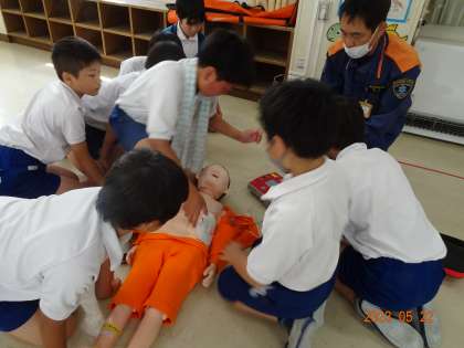 【救急救命講習 5年】5/22 公開日 2023/05/24 更新日 2023/05/24 各学年から 5年生が消防署の方に来ていただき、胸骨圧迫やAEDの使用法などを学ぶ救急救命講習を実施しました。身近な方が万一の場合に大切な命を救うことができるよう、一人一人真剣な表情で取り組んでいました。