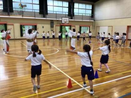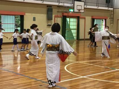 保存会の皆様方におかれましては、お忙しい中、2学年に連続で教えていただき、ありがとうございました。素敵な浴衣姿で一緒に踊ってくださった楽しい体験は、きっと子どもたちの心に残ることでしょう。