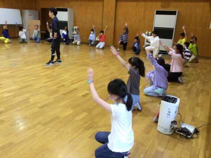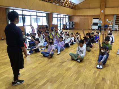 ほおのきホールで学年活動。学年全員で一つの表現運動に取り組んでいます。気持ちを合わせ、美しい表現を作り上げる事が目標です。野外学習で練習のスタートをすることで、これからの進歩を実感できるようにしたいと考えています。
