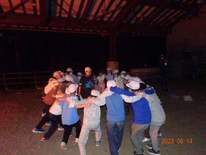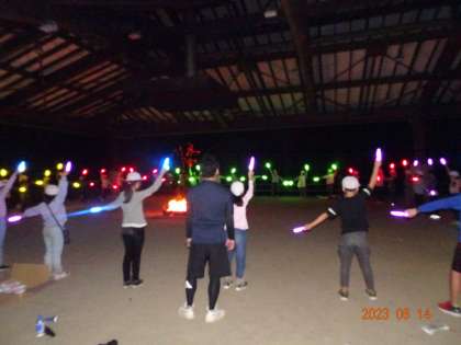 キャンプファイヤーの大成功に円陣を組んで喜び合いました。