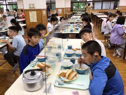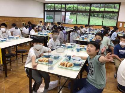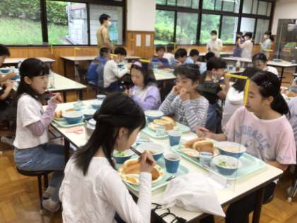 5年 野外学習 2日目朝食 公開日 2023/06/15 更新日 2023/06/15 各学年から どんぐり食堂での朝食。メニューは、ロールパン、シチュー、ウインナー、コロッケ、サラダ、いちごジャムです。 美味しく食べて今日も元気に頑張ります。