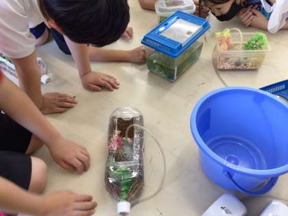 【5年生 理科 メダカの観察】6/16 公開日 2023/06/16 更新日 2023/06/16 お知らせ 野外学習に行っている間お世話ができなかったメダカのために、水を入れ替えたり、ポンプで空気を送ったりしました。その後は雌雄の識別や、卵からかえった赤ちゃんメダカの観察に取り組みました。