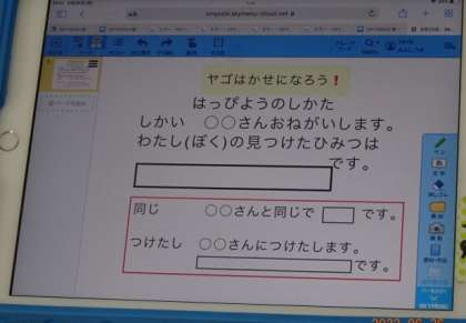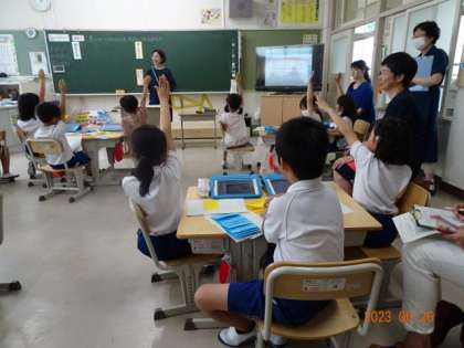 【2年 生活科授業研究】6/26 公開日 2023/06/30 更新日 2023/06/30 各学年から 生活科「生きているってすごい!」の研究授業を行いました。自然観察の森で観察したヤゴについて「見たこと」「聞いたこと」「本で調べたこと」を友達に伝えあいました。タブレットに示された話型をつかって、友達の意見と自分の意見を比べながら発言できました。ヤゴのひみつをたくさん発表して、考えが深まっていきました。