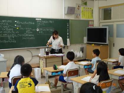 2年2組で算数「かさ」の研究授業を行いました。2人の先生が用意したお茶のポットに入る水の量をどうやって比べたらよいか、子どもたちは真剣に考え話し合いました。