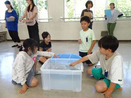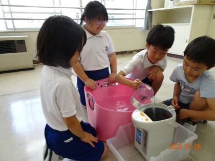 その後、生活科室に移動し、1リットルマスを初めて使って、水槽や湯沸かしポット、やかんに入る水の量を調べてみました。水をこぼさないように、慎重に水を移す子どもたち。体験を通して、かさの測り方や量感を学び合いました。