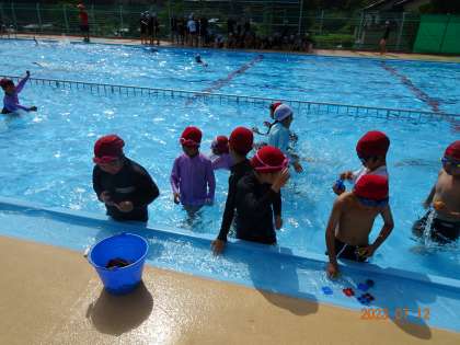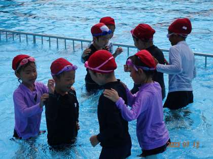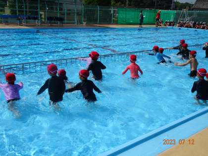 【2年 プール納め】7/12 公開日 2023/07/12 更新日 2023/07/12 各学年から 2年生のプール納め、宝探しや水中リレーを行い、プールの授業を楽しく締めくくりました。熱中症の心配のため、前倒しでの実施となりました。「プールは大好き!でも、まだ、上手には泳げない」という子もいます。夏休みにお家の方と少しずつ練習をしながら、楽しい思い出を作っていただければと思います。