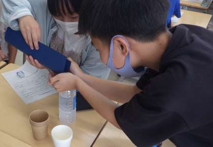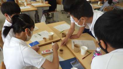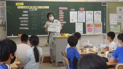 6年生の食育「ジュースの中に入っている砂糖の量を調べよう」の授業で、6種類のジュースの中に入っている砂糖の量を糖分計で調べてみました。コーラなどの炭酸飲料だけでなくリンゴやオレンジジュースの中にも、500ml中50gを超える糖分が入っていることが分かりました。ジュースの中に入っていたのと同じ量の砂糖を水に溶かして飲み比べてみると、「ジュースは美味しく飲めるのに、砂糖水は甘すぎた。」とびっくりする子どもたち。「食品添加物で味をごまかされているから、知らず知らず砂糖をたくさんとり過ぎているんだ。」と気付き、暑い夏の水分補給は、麦茶などの砂糖が入っていないものを飲もうと意識を強くもっていました。