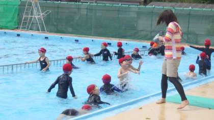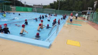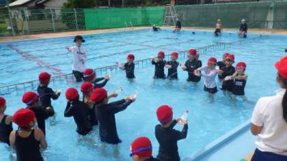 【1年生 プール納め】7/13 公開日 2023/07/19 更新日 2023/07/19 各学年から 1年生がプール納めをしました。小学校へ入学して初めてのプール。はじめは水が苦手だった子もずいぶん水になれて楽しく水遊びに取り組むことができました。この日は、最後にマヨネーズなどの入れ物を使って水鉄砲をみんなで楽しみました。