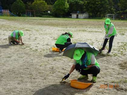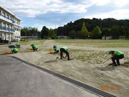 夏休み中に運動場にはたくさんの草が生え、すっかり緑色になってしまいました。