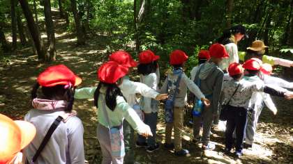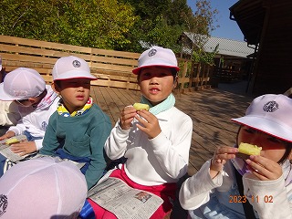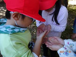【1年2組 トヨタの森】11/1 公開日 2023/11/13 更新日 2023/11/13 各学年から 11月1日(水) 1年2組がトヨタの森に行きました。渋柿やお茶の葉の味を確かめたり、8つの目をもつザトウムシを観察したりしました。森の中では、1列に並んで、列車になり、坂道を登ったり、降りたりするネイチャーゲームをしました。いっぱい遊んだ後には、学校で育てたサツマイモを石窯でやいてもらって食べました。とってもおいしかったです。