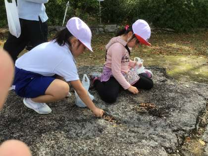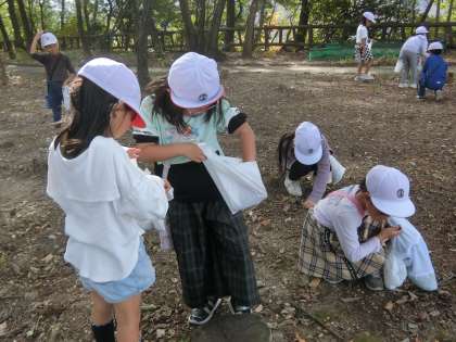 【1・2年生 宝来南公園へ行きました】11/6 公開日 2023/11/13 更新日 2023/11/13 各学年から 11月6日(月)秋晴れの中、1・2年生合同で宝来南公園へ出かけました。どんぐりやまつぼっくりをたくさん拾って笑顔いっぱいの子どもたち。この後、生活科の授業で使っていきます。